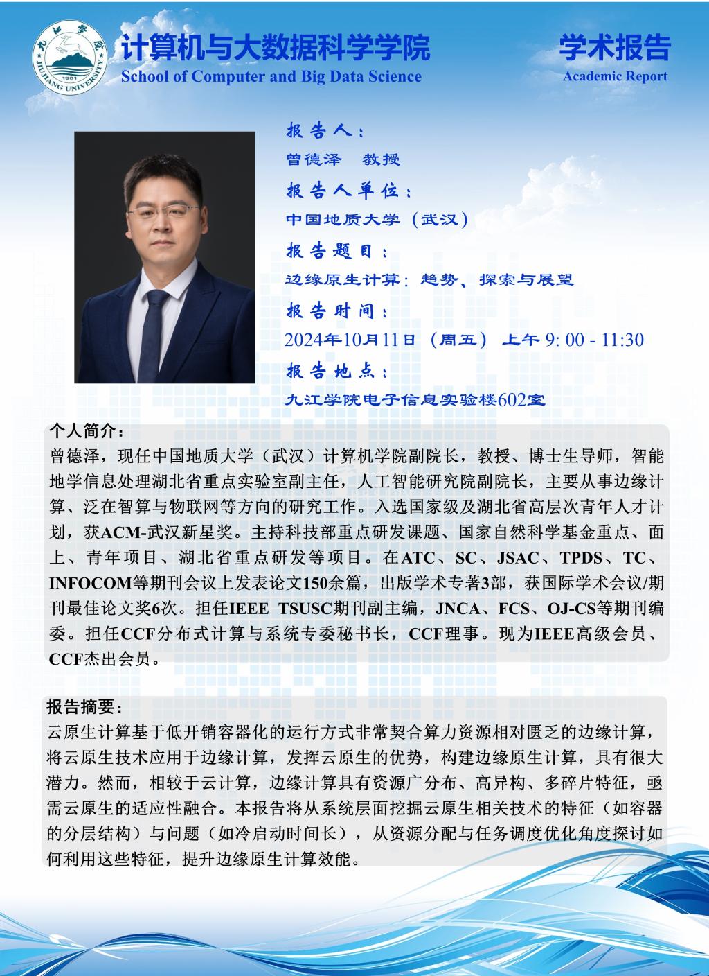 2024年10月11日学术报告(曾德泽 教授,中国地质大学(武汉))
