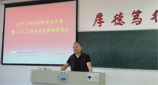 首先,pg国际电子网站院长邓安远教授对专业导读暨颁奖典礼做了致辞。邓院长代表学院全院师生向获奖的同学表示了祝贺,希望他们再接再厉,再创佳绩,同时向新入学的2023级软件工程专业全体同学表示了热烈的欢迎。邓院长在致辞中回顾了计算机学院软件工程专业的办学历史,总结了专业的建设成效;希望软件教研室师生,围绕特色化应用型软件工程专业建设,在教科研各方面展现自己的活力;同时,勉励同学们“立报国志、奉敬业情、牢记‘竞知向学、厚德笃行’的校训”,用自己的汗水、努力和智慧做画笔,为自己的人生之路、大学生活描绘五彩斑斓的色彩。