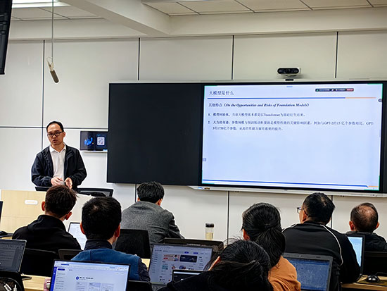 学院院长邓安远、党委书记邹国辉、党委副书记王玉伟、副院长彭虎等班子成员出席开结班仪式。邓安远在开班仪式上作动员讲话,他指出,人工智能技术飞速迭代发展,在一定程度上助推高校在人才培养、专业建设、课程设计等方面加快改革步伐,倒逼教师必须在教学内容、教学手段上进行革新。他强调,国内很多高校已经在推进人工智能通识教育、专业融合、专业整合,而我校新一轮人才培养方案也对全校计算机课程公共教学提出了改革要求。在这个人工智能技术爆炸式增长的时代背景下,作为新时代的教育工作者,每一位从事计算机专业教育工作的教师都肩负着培养下一代科技人才的重要使命。我们要敢于接受挑战,勇于拥抱新技术,并且善于将这些新技术转化为有效的教学手段,将最先进的人工智能理念和技术融入到日常教学中。希望每位教师都能充分利用这次宝贵的培训机会,深入学习AIGC及大模型相关技术,并思考如何将其有效地结合到自己今后的课堂教学、课程体系中去,创造更多具有创新性的典型教学案例,为学生提供个性化学习体验,激发学生的创新思维,提高应用型人才的培养质量。