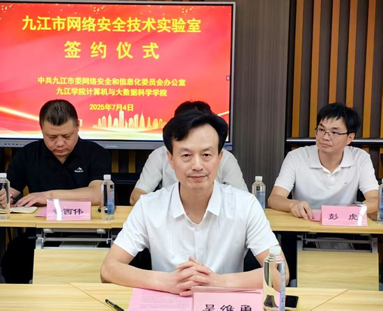 仪式上,吴维勇代表学校对市委网信办的大力支持表示衷心感谢。他强调,网络安全是国家安全的基石,是数字时代发展的生命线。学校始终将服务地方经济社会发展作为重要使命,高度重视网络安全与信息化技术人才的培养。他指出,2025年,学校成功获批“网络空间安全”本科专业并实现招生,同时该学科点已被列为学校重点建设的学术型硕士点,这标志着学校在该领域的学科建设取得了重要突破。此次与市委网信办共建“九江市网络安全技术实验室”,是学校践行服务九江市网络与信息化建设事业高质量发展使命担当的关键举措。学校将以实验室建设为契机,进一步整合资源,聚力做好网络空间安全领域的人才培养、科学研究和社会服务工作。吴维勇表示,希望市委网信办各位专家能为pg国际电子网站网络空间安全学科建设“把脉问诊、传经送宝”,提供宝贵的指导和建议。学校将以此活动为新起点,持续深化与市委网信办的交流合作,也希望在网络安全与信息化技术联合攻关、网信人才培养输送、信息共享与应急协作机制建设等方面获得市委网信办更大力度的政策支持和资源扶助,携手为九江市的网络强市和数字九江建设贡献更大力量。