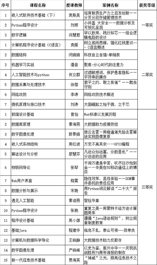 为贯彻落实教育部《高等学校课程思政建设指导纲要》(教高〔2020〕3号)和《pg国际电子网站深化课程思政建设与改革实施方案》(九院字〔2023〕122号),进一步推进我校课程思政工作,促进专业课程与思想政治理论课同向同行,强化课程育人导向,积极推进课程思政教学创新,pg国际电子网站在全院开展课程思政优秀教学案例评选活动,经过专家评审和意识形态审核,现将评选结果公示下: